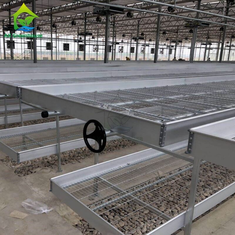 The movable rolling bench is designed for high-efficiency greenhouse cultivation. The main structure is built with hot-dip galvanized steel pipes, while the bench frame is made of high-strength aluminum alloy. The bench top uses expanded metal mesh with a hot-dip galvanized anti-corrosion finish, ensuring long-term durability and excellent resistance to rust and moisture.